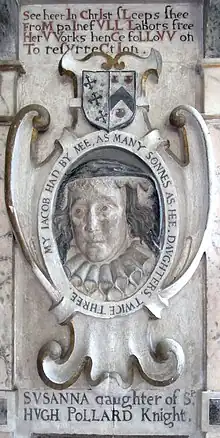 - Susanna Pollard, who married in 1596 as his second wife John Northcote (1570–1632), of Hayne, Newton St Cyres, near Crediton, whose splendid monument with standing effigy exists in Newton St Cyres Church. She was the mother of Sir John Northcote, 1st Baronet (1599–1676). A panel on the monument to her husband is dedicated to her memory and contains in the centre a sculpted relief of her head circumscribed by the following two lines of verse: