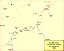 The trains ran over the alignment of the Mansfield and Pinxton Railway as modified by the Midland Railway, between Kirkby and Mansfield. The line from Codnor Park is in use for mineral traffic, and uses the M&PR route from Pinxton.[23]