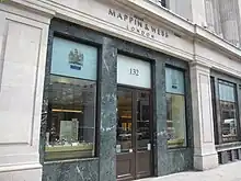 A branch of Mappin & Webb[10] once occupied a prominent location in the City of London at the junction of Poultry and Queen Victoria Street, adjacent to Bank junction. Designed in the neo-gothic style by John Belcher in 1870, the listed building was demolished in 1994 to make way for the construction of a postmodern office and retail building, No 1 Poultry, despite a fiercely fought campaign to save the 19th century building.