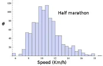 Histogram of the speeds in the 10 km race in Marabana 2012. Computed out of the official speeds reports.