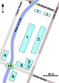 In the 1980s the university acquired and closed the stretch of Castle Street along the whole west boundary of its original property. The iron railings from St David Street to Union Street were removed. The university's architect, Colin Pilbrow, designed a new approach to the western side of the channel of the Leith.
