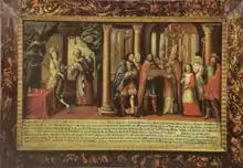 Another early illustration of Margaret's fate can be found in the chapel of Thierberg Castle in Kufstein. It was painted by Michael Waginger and shows both the insult of the beggar and the baptism of many small children.