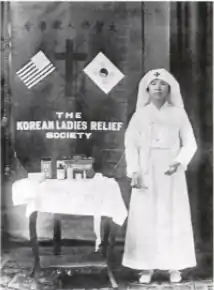 Maria Whang (1865-1937) was a Korean-American educator and community organizer. In 1913, she became the first leader of the Korean Women's Association in the Territory of Hawaii.[1] Whang was born in Pyongan Province, Korea. In 1905, she emigrated to Hawaii with her daughter and two sons. When they arrived in Hawaii, she told her son Ok Kang about her escape from her affluent husband who had many mistresses. [2] Whang was a Methodist, and the church assisted her in moving to the United States.[2] She felt that in Korea she was "not allowed to be anything", and desired the freedom she saw in the United States.[2] She was an early educator of plantation children,[3] and she established the Korean Women's Association (Taehan Puinhoe) which merged in 1919 with the Korean Ladies Relief Society.[4]
