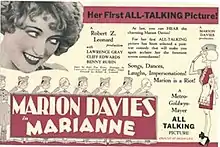 Marianne is a 1929 pre-Code romantic-musical film set at the end of World War I. Marianne is French farm girl who, although her French fiancé is away, fighting, falls in love with an American soldier. It is a remake of a silent film that was released earlier in 1929. Although the films feature mostly different casts, Marion Davies starred in both versions. This was Davies' first released talking movie. The pictures were released less than eleven years after the Armistice, and the title would have had a profound meaning for European audiences. “Marianne” has been a beloved personification of France and the battle for democracy—and the courage of French women in particular—since the Revolution. She was a key figure in French propaganda, and American men who served in Europe in 1917-1918 would have seen representations of her all around them, in public buildings, on posters and in newspapers, on coins and postage stamps.