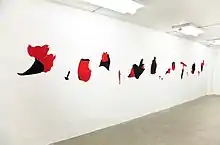 Later came works on canvas and wall drawings, characterized by the use of red, black and gold, consisting mostly of borders, features and amorphous, semi-abstract forms and form developments. These include the wall drawings Das Buch der 5 Ringe von Mushahi, 1991, at Kiel Central Station or Les Guédés dansent toujours (2012).