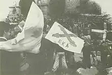 Both Zufía's parents came from Carlist families and were Carlists themselves.[25] His father was member of Traditionalist trade unions and under the pen-name “Rozala Afizu” he contributed to Traditionalist dailies, El Pensamiento Navarro and La Constancia.[26] Already in his early teens the young Mariano engaged in the movement; he joined Muthiko Alaiak, the folk group animated by the iconic Pamplonese Carlist Ignacio Baleztena, he played football in the amateur team formed by boys from the local Carlist círculo,[27] entered Agrupación Escolar Tradicionalista and took part in school strikes of 1935–1936, staged as protests against what was perceived as anti-religious educational policy of the Republic.[28] A later hagiographic biography underlines Zufía's Catholic conviction as the key motive behind his political choice, and suggests that it outweighed some socialist leaning, took after his maternal uncle.[29] In the mid-1930s Zufía enlisted to requeté and as an adolescent boy trained with wooden rifle in the hills surrounding Pamplona.[30] He actually served in requeté combat units during two short strings, in the summer of 1936 and in the spring of 1937.