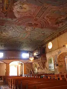 Connected to the choir loft was a small area where a large organ with metal pipes could be seen. The organ, which still needed restoration at the time of the earthquake, was last played in 1975.[17] Estimated to have been built by Spanish pipe organ makers between the 17th and 19th centuries, the Maribojoc organ was one of the remaining 14 Spanish era pipe organs, three of which were in Bohol.[18] Also located in the choir loft was a lectern for choral books. On the ceiling, a mural of the sacrament of baptism depicted Father Quiterio Sarigumba as the officiating priest.[14] Father Sarigumba, also known as the "builder priest", was known for having repaired portions of Jagna Church and the addition of new facades to the churches of Inabanga and Panglao. A passage to the belfry was located in the choir loft.[3]