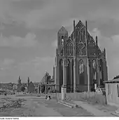 At the liberation of Prenzlau at the end of World War II by the Red Army on 27/28 April 1945,[4] the church burnt out with the massive roof truss of the nave and the vault collapsed; the enclosing walls and pillared arcades remained. In 1947, the gables of the north tower end, which had survived until then, collapsed. In 1949/50, the east gable was secured against collapse.[5] The reconstruction began in 1970, in 1972 the assembly of the roof truss, in 1973/74 the covering of the gable roof with copper plates as well as the repair of the staircase in the towers and the covering of the Margaret Chapel. From 1972 to 1988, the tower facades were repaired, the interiors of the south chapels were refurbished and the east gable and the east south facade were restored. In 1982, the north tower was completed, in 1984 the roof of the south tower, in 1988 the roofing and vaulting of the north porch and in 1990/91 the renovation of the façade. In 1990, a celebration was held for what had been achieved. The modern rose window with the theme Destruction and Reconstruction was realised by the glass artist Johannes Schreiter and handed over in 1995. In 1997, the altar was put up again.