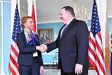Marija Pejčinović Burić (pronounced [mǎrija pejt͡ʃǐːnoʋit͜ɕ bûrit͜ɕ]; born 9 April 1963)[1] is a Croatian politician of the centre-right Croatian Democratic Union party who served as Minister of Foreign and European Affairs and First Deputy Prime Minister of Croatia from 2017 to 2019. She was the third woman to hold the post of foreign minister, following Kolinda Grabar-Kitarović and Vesna Pusić. Pejčinović Burić previously served as a Member of Parliament during its Sixth Assembly (2008–2011), representing the 6th electoral district.