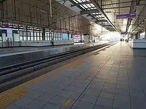 The east extension was inaugurated on July 1, 2021, and Marikina–Pasig station opened to the public on July 5, 2021.[15] Rides for the East Extension were free of charge until July 18, 2021.[16] When the station opened, the westbound platform was only operational for temporary bidirectional shuttle services since the integration works of the east extension to the line's existing systems was not completed. The eastbound platform became operable on September 3, 2021, after integration works were completed.[17]