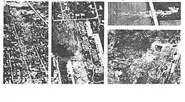 The Marion tornado touched down near Carteville, at 3:00 p.m. resulting in damage to a subdivision near John A. Logan College. It then tracked into downtown Carterville then tracked southeast into Crainville, Illinois, after which it caused moderate damage to the area surrounding Williamson County Regional Airport.[17] At 3:16 p.m. the tornado either formed a new funnel or changed course as it tracked into the west side of Marion along Illinois Route 13, causing extensive damage throughout the city. During this time the tornado was observed have a multiple-vortex structure with up to three subvortices swirling around the main tornado.[2] The tornado struck a car along Interstate 57, causing it to explode.[2] By 3:30 p.m. the tornado had exited the city and dissipated near Illinois Route 166. The tornado had destroyed the Shawnee Village Apartment Complex and severely damaged three shopping centers. It heavily damaged the area surrounding the Interstate 57 and Illinois Route 13 interchange including the Marion Ford dealership, and also damaged two schools, 648 homes, and 52 businesses.[2] It caused 10 deaths and 181 injuries, and left over 1,000 people homeless.[18][7]
