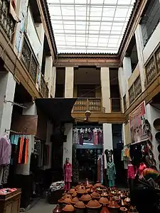 The maristan continued to operate in this capacity up until 1944, when it was destroyed by a fire.[5] In 1951, the French colonial authorities reopened a new maristan in a different location intended to serve as successor to the Maristan of Sidi Frej and designed to function according to modern Western psychiatric theories.[6][8] Its inauguration may have also been in part motivated by attempts to make colonial rule, coming under heavy opposition, appear more respectful of local Muslim traditions and institutions.[8] Meanwhile, the site of the original maristan was adapted or rebuilt as a funduq-type building with traditional architecture that now houses various shops.[1][5][2] It continues to act as a shopping center currently, although as of 2018 there were proposals to restore it and convert it back to a center offering medical services.[3]