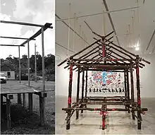 The case study The House of Agreement Between Humans and the Earth (2022), inspired by the palafitas of Amazonia, is a simple wooden house held together by fiber rope. The work combines built architecture with the notion of social architecture in dialogue with nature. The base, representing earth, supports the world of social agreements, including agreements between humanity and nature. Ropes extending to the gallery ceiling – connecting earth and sky – represent human dependence on and coexistence with nature. Drawn images on the structure illustrate such agreement as reflected in society and the life of the planet, in particular the struggle for the rights of nature in Australia. The work was exhibited at the 23rd Biennale of Sydney in 2022.[18]