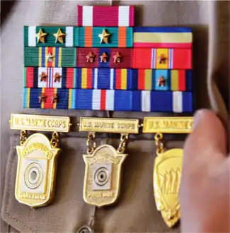 The U.S. Marine Corps award two types of Marine Corps Marksmanship Qualification Badges, one for the service rifle and one for the service pistol, to all Marines who qualify at three different qualification levels (highest to lowest): expert, sharpshooter, and marksman. These qualification badges are suspended beneath a brooch which bears the name of the type of weapon (rifle or pistol) and the qualification level earned. Some of these badges are different in appearance, depending on the type of weapon and qualification level.[2]