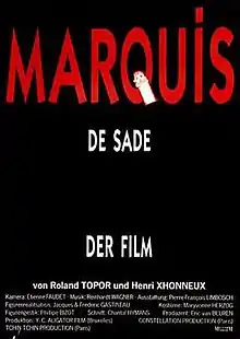 Marquis is a 1989 French-language film, produced in Belgium and France, based on the life and writings of the Marquis de Sade. All the actors wear animal masks,[1] and their voices are dubbed. There are a few scenes involving clay animation. The film was a project by French cartoonist Roland Topor, who had previously delivered the imagery for the animated cult classic La Planète Sauvage (1973). Marquis too is considered a cult classic today.[2][3][4]