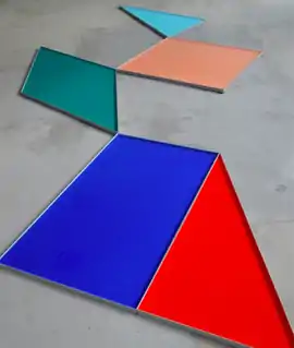 Though her works entail unusual materials such as plastic gels, sequins, pools of ink and tinted fluids, but not paint itself, Schumacher’s use of form and colour is said to derive from painterly thinking. About her largescale monochromatic painting "Along the Square", the Marli Hoppe-Ritter Collection observes that the work "brings key questions about painting together—such as the relationship between surface and depth, the effect of colour, and last but not least the relationship between concrete geometrical form and the representation of visible reality."[3] An essay in the artist's 2012 catalog focusses on Schumacher's use of reflective materials: "Extension of space through mirrored surfaces is patently Schumacherian. The imaginary and real co-mingle in a spatial mirror painting, ensnared by its reflective surfaces and coaxed into dialogue by the entranced viewer."[4]