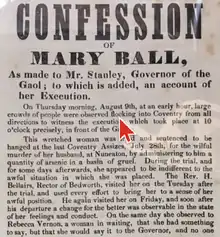 Mary Ball (1818–1849) was a Nuneaton housewife who poisoned her husband with arsenic. She was hanged in Cuckoo Lane, outside Coventry Gaol, before a crowd of about twenty thousand. She was the last person to be publicly executed in Coventry.[1][2][3][4]