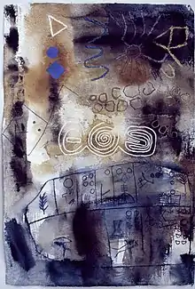 Lloyd Jones's work is greatly inspired by the landscape in which she grew up, a prominent feature of which is the scarred landscape associated with a legacy of lead mining. This sense of place is further augmented by her own Welsh-language cultural inheritance. Ann Price-Owen has referred to her work as that of a custodian of her cultural heritage, which is implicitly language-based.[5] Experiences outside Wales have also provided key stages in her work's development. An interest in early alphabets was precipitated by a visit to Ilkley Moor to view cup and ring marks.[6] Incorporation of such marks into the work led to an identification with the 18th-century Welsh bard, scholar and antiquarian Iolo Morganwg, who created his own bardic alphabet, "Coelbren". She regards the use of scripts such as the ancient ogham script in her work as an oblique reference to the otherness of Welshness. Iwan Bala argues that these works demand some form of contextualising, revealing the artist's concerns and her position within her own culture.[7] In the Summer of 2009 Ruthin Craft Centre showed Lloyd Jones's early textile work, which led to a re-evaluation of this work by a new audience.[8] A second show in 2013 was reviewed in the magazine Embroidery.[9] In February 2013 she was awarded the first Artist Residency at the Old College, Aberystwyth University, and moved into a new studio there.[10] Some of her paintings are in the public collections of the National Library of Wales, Amgueddfa Cymru – Museum Wales and Cardiff University.