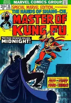 The character Shang-Chi first appeared in Special Marvel Edition #15 (December 1973) by Steve Englehart and Jim Starlin.[1] Shang-Chi appeared again in issue #16, and with issue #17 (April 1974) the title was changed to The Hands of Shang-Chi: Master of Kung Fu. Amidst the martial arts craze in the United States in the 1970s, the book became very popular, surviving until issue #125 (June 1983), a run including four Giant-Size issues and one Annual.
