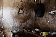 It is a simple loop big enough to hold a food container. It is made from two crossed straps of plaited palm leaflets. The Mi'laq is hanging freely from the ceiling, from wooden beams in the courtyard or in doorways. It is a simple and effective local utensil to protect small quantities of food from animals.