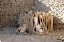 Additionally, Garidah is a good fencing material used for making small hutches called Qafas (قفص) to protect the chicken against wild animals. The Manasir also use it as roofing material to thatch their traditional mud houses (Galus, جالوص).