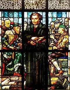 "Luther et la Diète de Worms en 1521" with Matthew 10:32 in German, on the window of Église protestante de Notre Seigneur Jésus-Christ de Bischheim, Alsace, Bas-Rhin. Joseph Ehrismann (1880-1937).