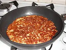 There are numerous ways to prepare the dish, as well as flexibility in ingredients.[4][5] The basic ingredients are matzah, eggs, and a "softening" liquid for the matzah, such as hot water or milk.[4] Typically the dry matzah is broken into pieces, briefly softened in water or milk, mixed with beaten eggs, and fried in a skillet. The frying is done with oil or butter.[6] Alternately, the matzah is crumbled and then combined with beaten egg. The matzah and egg mixture may be scrambled, set to cook like a pancake, or fried like a tortilla.[4][3]