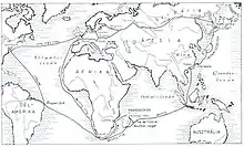 Benyovszky's Memoirs state that the route taken by the ship, having rounded the southernmost point of Kamchatka, was generally north and eastwards, taking in Bering Island, the Bering Strait, Alaska, and the Aleutian Islands.[28]   However, in the time available (four weeks according to Benyovszky's own account), this 6000-mile itinerary is barely credible for a leaky ship and inexperienced crew. Such a route is completely absent from three other separate accounts of the voyage (by Ippolit Stepanov,[29]   Ivan Ryumin,[30] and Gerasim Izmailov[31]). Additionally, some of the events described by Benyovszky are so implausible that the entire voyage in this area must be considered a fiction.[32]