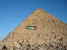 A Palestinian flag presented on the Temple of Giza, a 2009 stunt which Geller claims to have been a part of.
