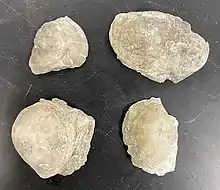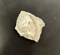 This formation is the least accessible of the three formations at Maysville, requiring one to hike up a steep trail located near the South end of the roadcut. It is important to be cautious while hiking the trail to Bellevue as ticks and poison ivy are prevalent in the forested areas. North America was underwater during the Ordovician period therefore the Bellevue formation was formed from shallow water deposits, consisting mostly of shale.[2] Within the layers of shale, brachiopod fragments are prevalent, and commonly vinlandostrophia are found. The Bellevue formation contains many small crinoid stems due to the deposits that came from the shallow water in the most recent years of the Ordovician period. The base of the Bellevue formation contains a large collection of echinoderms.[3] Crinoids are a part of the echinoderm phylum. The Bellevue formation also comprises larger fragments of bryozoa as well as vinlandostrophia in comparison to the Fairview and Kope formations.[2] Visitors can find a majority of these fossils in the lower and base part of the Bellevue formation. The top of Bellevue along with parts of the base are difficult to access and potentially dangerous.