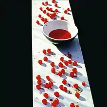 Set against a black background, the front cover image consisted of a bowl of cherry-red liquid placed on a cream-coloured wall and surrounded by loose red cherries, as if the fruit had been emptied from the bowl.[42] On the back cover, a photo taken by Linda in Scotland showed her husband with Mary tucked inside his fur-lined leather jacket.[59][60] Madinger and Easter comment that, unlike Lennon, McCartney did not feel the need to include his wife on the cover, and her back-cover photo was a "stunning" contribution from the former professional photographer.[23] In a 2013 news article recalling the album's release, the Philadelphia radio station WMMR described the photo of McCartney and his baby daughter as "iconic" and reflective of "his ultimate message: 'Home, family (and) love'."[61]