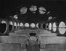 Most, although not all, McKeen cars had the distinctive "wind-splitter" pointed aerodynamic front end and rounded tail. The porthole windows were also a McKeen trademark, adopted allegedly for strength after the 7th production car. A dropped central door, as pictured, was also present on the majority of the cars. Two lengths, 55 and 70 feet, were offered; either could be fitted out with a large mail and express area ahead of the center doors, a smaller mail/express area, or the car could be all seats for a maximum capacity of 64 or 105 respectively.