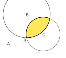 The figure shows an example. There are three voters in the electorate, with ideal points A, B and C. Voters prefer policies that are closer to them, i.e. they have circular indifference curves. The circles show B's and C's indifference curves through a policy X. If a candidate were to propose X, then the other candidate could beat him by proposing any point in the yellow area. This would be preferred by B and C. Any point in the plane will always have a set of points that are preferred by 2 out of 3 voters. In fact, you can get from any point to any other point by a series of majority votes.