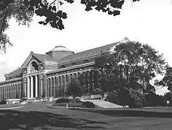Though White's subsequent life was plagued by scandals, and McKim's by depression and the loss of his second wife, the firm continued to produce magnificent and varied work in New York and abroad.[8] They worked for the titans of industry, transportation and banking, designing not only classical buildings (the New York Herald Building, Morgan Library, Villard Houses, and Rhode Island State Capitol), but also planning factory towns (Echota, near Niagara Falls, New York; Roanoke Rapids, North Carolina; and Naugatuck, Connecticut),[9] and working on university campuses (the University of Virginia, Harvard, Adelphi University and Columbia). The magnificent Low Library (1897) at Columbia was similar to Thomas Jefferson's at the University of Virginia, where White added an academic building on the other side of the Lawn.