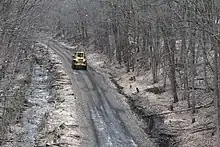 McMickle Cut, the first major cut west of Port Morris Junction on the Cut-Off, begins just west of County Road 602 (site of a future grade crossing) in Hopatcong. Sussex County Road 605 (Sparta-Stanhope Road) crosses over the Cut-Off about midway between the ends of the cut (MP 47.8), near its deepest point, where the line is on a 2° curve (70 mph, 113 km/h).[2]