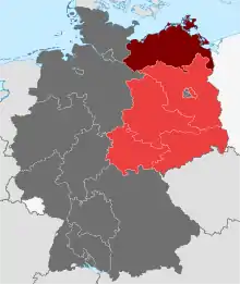 The State of Mecklenburg (German: Land Mecklenburg) was a subdivision of the Soviet occupation zone (until 1949) and one of the states of East Germany (from 1949) which corresponds widely to the present-day German state Mecklenburg-Vorpommern. The state was originally formed as an administrative division, the State of Mecklenburg-Vorpommern (Land Mecklenburg-Vorpommern), by the Soviet Military Administration in Germany (SMAD) in July 1945. It consisted of the 1934-established Mecklenburg (a merger by the Nazi Gauleiter Friedrich Hildebrandt of the free states of Mecklenburg-Schwerin and Mecklenburg-Strelitz) and parts of the former Prussian provinces of Pommern (Western Pomerania to the Oder–Neisse line) and Hanover (Amt Neuhaus). The city of Swinemünde (now Świnoujście) was handed over to Poland in October 1945, becoming part of Szczecin Voivodeship. In November 1945, a transfer of small territories along the Inner German border to the former Province of Schleswig-Holstein was carried out as part of the Barber–Lyashchenko Agreement. About 2.1 million people were estimated to live in Mecklenburg in 1946.[1] From 1947, the term Vorpommern was excluded from the official name as the SMAD feared that this would support revisionist actions against formerly German parts of Poland (in particular Farther Pomerania). Compared to the administrative divisions of Nazi Germany, Mecklenburg comprised the Gaue Mecklenburg and parts of Pomerania and Eastern Hanover.