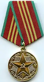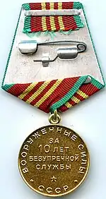The Medal "For Impeccable Service" (Russian: Медаль «За безупречную службу») was a Soviet military award for long service awarded to deserving members of the military personnel of the armed forces of the USSR, of the Interior Ministry of the USSR and of the Ministry for the Protection of Public Order of the USSR, to recognise ten, fifteen and twenty years of faithful and impeccable service to the state.