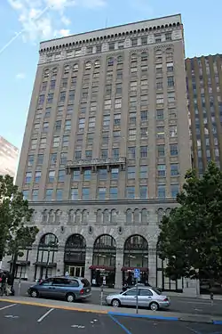 The building is 14 stories high with a foundation that encloses a concrete subterranean basement. It has a reinforced concrete frame structure, also known as "ductile frame" construction. The exterior walls are concrete clad, faced with granite on the lowest three stories and with brick on the remainder of the building.[3] It is built in an "L" configuration, with the two wings fronting A Street and 3rd Avenue. Its design is neoclassical revival with a decorative facade of brick, quarried granite, and ornamental cast iron trim. It has a gabled rooftop finished with Spanish tile, a gravel-covered lower observation roof over a rolled mineral surface, and rosette-style windows.[5] Interior features include a marble lobby floor and staircase with a restored coffered ceiling.[6]