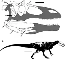 Based on Megaraptor, the premaxillary bone at the tip of the snout is small, with a long and rod-like branch of bone which extends above the external nares (nostril holes). The nares themselves were very large and elongated, akin to some early tyrannosauroids (Dilong, Proceratosaurus, etc.). The snout also had some similarities to carcharodontosaurids, namely the straight upper edge of the maxilla and rectangular nasal bones. The parietal bones at the top of the skull, behind the eyes, had a strongly developed sagittal crest, as in tyrannosauroids.[8] Otherwise, the rear part of the skull is rather simple, without any pronounced crests or bosses, although the lacrimal and postorbital bones did have rugose patches in some genera. Aerosteon and Murusraptor possessed a pneumatic quadrate, as in a few allosauroids (Sinraptor, Mapusaurus) and tyrannosauroids.[13] The dentary, which is only known in Australovenator, is long and graceful, with the first tooth smaller than the rest (as in tyrannosauroids). The mandible as a whole has only a single meckelian foramen, as in carcharodontosaurians, tyrannosaurids, and ornithomimids.[7] However, the rear part of the mandible (as seen in Murusraptor) was significantly more lightly built than that of tyrannosauroids. Preserved braincase material has similarities to both carcharodontosaurians and tyrannosauroids.[13]