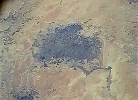 The southwestern[18] and northern side of the Meidob volcanic field drain into the Wadi Harra and subsequently into the Wadi Magrur, which flows northeastward when it carries water.[19] In the present day most of the wadis draining the Meidob northeastward such as Wadi Umm Afarit end in inland deltas, in past wet periods they reached the Wadi Magrur.[20] In turn, Wadi Magrur discharged into Wadi Howar, leading to the development of wetlands.[21]