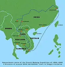 The Mekong expedition of 1866–1868, conceived and promoted by a group of French colonial officers and launched under the leadership of captain Ernest Doudard de Lagrée, was a naval exploration and scientific expedition of the Mekong River on behalf of the French colonial authorities of Cochinchina.[1] Its primary objective, besides scientific documentation, mapping, and the mission civilisatrice, was an assessment of the river's navigability in order to link the delta region and the port of Saigon with the riches of southern China and upper Siam (modern day Thailand). Ambitions were to turn Saigon into a successful commercial center such as British controlled Shanghai at the mouth of the Yangtze River.[2][3]