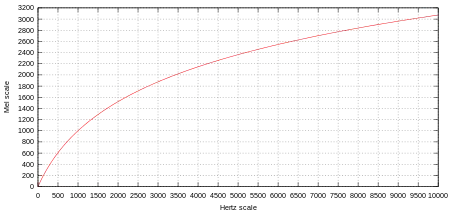 The mel scale (after the word melody)[1] is a perceptual scale of pitches judged by listeners to be equal in distance from one another. The reference point between this scale and normal frequency measurement is defined by assigning a perceptual pitch of 1000 mels to a 1000 Hz tone, 40 dB above the listener's threshold. Above about 500 Hz, increasingly large intervals are judged by listeners to produce equal pitch increments.