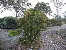 The flowers are bright red and are arranged in spikes on the ends of branches that continue to grow after flowering and sometimes in the upper leaf axils. The spikes are 50–60 mm (2.0–2.4 in) in diameter. The petals are 3.6–5.3 mm (0.1–0.2 in) long, fall off as the flower ages and there are 35-50 stamens in each flower. Flowering occurs from late winter to summer, sometimes in other months and is followed by fruit that are woody capsules, 4.6–6.5 mm (0.2–0.3 in) long.[3][4]