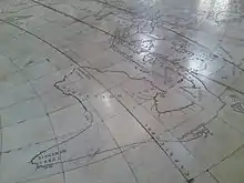 The map by Thévenot, Hollandia Nova—Terre Australe in the Relation de Divers Voyages..., is a French version of the 1644 chart of Abel Tasman's discoveries using information from Dutch sources, notably Joan Blaeu's world map published in 1659.[5] Although Thévenot said that he had taken his chart from the one inlaid into the floor of the Amsterdam Town Hall, in fact it appears to be an almost exact copy of that of Joan Blaeu in his Archipelagus Orientalis sive Asiaticus published in 1659 in the Kurfürsten Atlas (“Atlas of the Great Elector“).[6] The map of the world set into the floor of the great hall of the Amsterdam Town Hall was drawn from Blaeu's world map of 1648. Once Blaeu's map of the world appeared other mapmakers, such as Thévenot, copied his depiction of New Holland. Hollandia Nova in the Kurfürsten Atlas is shown as it appears in Blaeu's world map of 1648, Nova et Accuratissima Terrarum Orbis Tabula.[7] Thévenot divided the continent in two, between Nova Hollandia to the west and Terre Australe to the east of a latitude staff running down the meridian equivalent to longitude 135 degrees East of Greenwich.[8] The differentiation between Nova Hollandia to the west and Terre Australe to the east of the meridian corresponding to 135° East of Greenwich, emphasized by the latitude staff running down that meridian, appears to have been an initiative of Thevenot's, as there is no such division on Blaeu's map or on the Amsterdam Town Hall map.[9] This apparent division may have been fortuitous, as on other Dutch maps of this period Terra Australis or t'Zuid Landt ("the South Land") appears with the name, Hollandia Nova as an alternative name for the whole country.[10] The meridian staff dividing Nova Hollandia from Terre Australe on Thévenot's map fell along the meridian that represented the western limit of Spain's imperial claim in the South Pacific arising from the Treaty of Tordesillas of 1494 and act of possession of the South Land made by Pedro Fernández de Quirós in 1606. This western limit of Spain's claim is shown on the 1761 map of the Spanish Empire by Vicente de Memije, Aspecto Symbolico del Mundo Hispanico.[11]