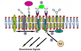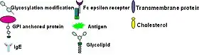 Immunoglobulin E (IgE) signaling is the first convincingly demonstrated lipid rafts involving signaling process.[38][39][40] Evidence for this fact includes decreased solubility of Fc-epsilon receptors (FcεR) in Triton X-100 from steady state to crosslinking state,[38] formation of patches large enough to be visualized by fluorescence microscopy from gangliosides and GPI-anchored proteins,[41][42] abolition of IgE signaling by surface cholesterol depletion with methyl-β-cyclodextrin[43] and so on. This signaling pathway can be described as follows: IgE first binds to Fc-epsilon receptors (FcεR) residing in the plasma membrane of mast cells and basophils through its Fc segment. FcεR is a tetramer consist of one α, one β and two γ chains.[40] It is monomeric and binds one IgE molecule. The α chain binds IgE and the other three chains contain immune receptor tyrosine-based activation motifs (ITAM). Then oligomeric antigens bind to receptor-bound IgE to crosslink two or more of these receptors. This crosslinking then recruits doubly acylated non-receptor Src-like tyrosine kinase Lyn to phosphorylate ITAMs. After that, Syk family tyrosine kinases bind these phosphotyrosine residues of ITAMs to initiate the signaling cascade.[38][39] Syk can, in turn, activate other proteins such as LAT. Through crosslinking, LAT can recruit other proteins into the raft and further amplify the signal.[44]