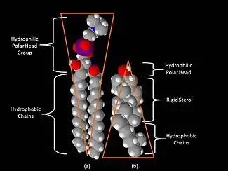 One key difference between lipid rafts and the plasma membranes from which they are derived is lipid composition. Research has shown that lipid rafts contain 3 to 5-fold the amount of cholesterol found in the surrounding bilayer.[7] Also, lipid rafts are enriched in sphingolipids such as sphingomyelin, which is typically elevated by 50% compared to the plasma membrane. To offset the elevated sphingolipid levels, phosphatidylcholine levels are decreased which results in similar choline-containing lipid levels between the rafts and the surrounding plasma membrane. Cholesterol interacts preferentially, although not exclusively, with sphingolipids due to their structure and the saturation of the hydrocarbon chains. Although not all of the phospholipids within the raft are fully saturated, the hydrophobic chains of the lipids contained in the rafts are more saturated and tightly packed than the surrounding bilayer.[5] Cholesterol is the dynamic "glue" that holds the raft together.[3] Due to the rigid nature of the sterol group, cholesterol partitions preferentially into the lipid rafts where acyl chains of the lipids tend to be more rigid and in a less fluid state.[5] One important property of membrane lipids is their amphipathic character. Amphipathic lipids have a polar, hydrophilic head group and a non-polar, hydrophobic region.[8] The figure to the right shows the inverted cone-like shape of sphingomyelin and the cone-like shape of cholesterol based on the area of space occupied by the hydrophobic and hydrophilic regions. Cholesterol can pack in between the lipids in rafts, serving as a molecular spacer and filling any voids between associated sphingolipids.[8]