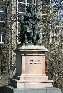Memorial for Franz Xaver Gabelsberger is a monument located in Maxvorstadt, Munich, Bavaria, Germany. The monument is a bronze sculpture by the German sculptor Syrius Eberle. It was dedicated shortly after the hundredth anniversary of the birth of Franz Xaver Gabelsberger (1789-1849), the inventor of a cursive shorthand system. Casting was by Ferdinand von Miller.