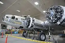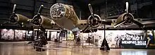 The Memphis Belle is a Boeing B-17F Flying Fortress used during the Second World War that inspired the making of two motion pictures: a 1944 documentary film, Memphis Belle: A Story of a Flying Fortress and the 1990 Hollywood feature film, Memphis Belle. It was one of the first United States Army Air Forces B-17 heavy bombers to complete 25 combat missions, after which the aircrew returned with the bomber to the United States to sell war bonds.[2] In 2005 restoration began on the Memphis Belle at the National Museum of the United States Air Force at Wright-Patterson AFB in Dayton, Ohio where, since May 2018, it has been on display.[3][4] The B-17 used in the 1990 feature film was most recently housed at the National Warplane Museum in Geneseo, New York but is currently undergoing extensive maintenance at the Palm Springs Air Museum in California.[5][6]