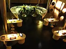 The initial storyline developed for the attraction would have seen riders enter a replica of the Orlando International Airport, before being ushered onto people movers taking them to the underground to the MIB training facility. However, executives were unsure of the concept and instead wanted at least one recognisable item from the 1997 film to be on the outside facade. Responding to the concern, designers chose the film's flying saucer-shaped towers, adding elements of the New York State Pavilion from the 1964 World's Fair, Dodgers Stadium, and the St. Louis Arch to form the facade.[7][17] Other elements of the storyline also did not make the final cut. The immigration office from the film is featured in the attraction's queue; however, it was intended that it would feature numerous animatronics. However, due to the large animatronics budget for the ride itself, this idea was scrapped. In homage, ride employees for the first few months of the ride's operation would take their breaks in the room, to give the effect of a working office.[17]
