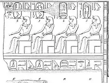 On the base of a statue from the sanctuary of Heqaib on Elephantine, a Mentuhotep is referred to as "Father of the gods".[8][9] This title probably refers to Mentuhotep's immediate successors, Intef I and Intef II who reigned as kings over Upper Egypt. From this title, many Egyptologists argued that this Mentuhotep was probably the father of Intef I and II,[4][8][10] and also that he was never a pharaoh, as this title was usually reserved for the non-royal ancestors of pharaohs.[5][6][7][8]